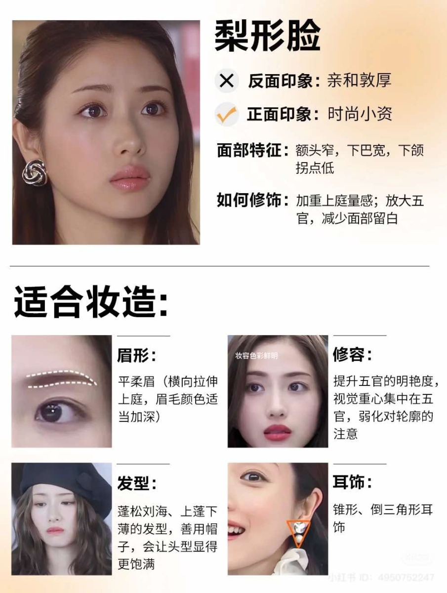 梨形脸的特点是下颌较宽,额头较窄。平柔眉能够在视觉上增加额头的宽度,使脸型更加均衡。发型方面,蓬松刘海、上蓬下薄的发型以及善用帽子都能有效修饰梨形脸。修容时,重点是提升五官的明艳度,将视觉中心集中在五官上。耳饰方面,锥形或倒三角耳饰能够吸引视线向上移动,平衡下颌的宽度。