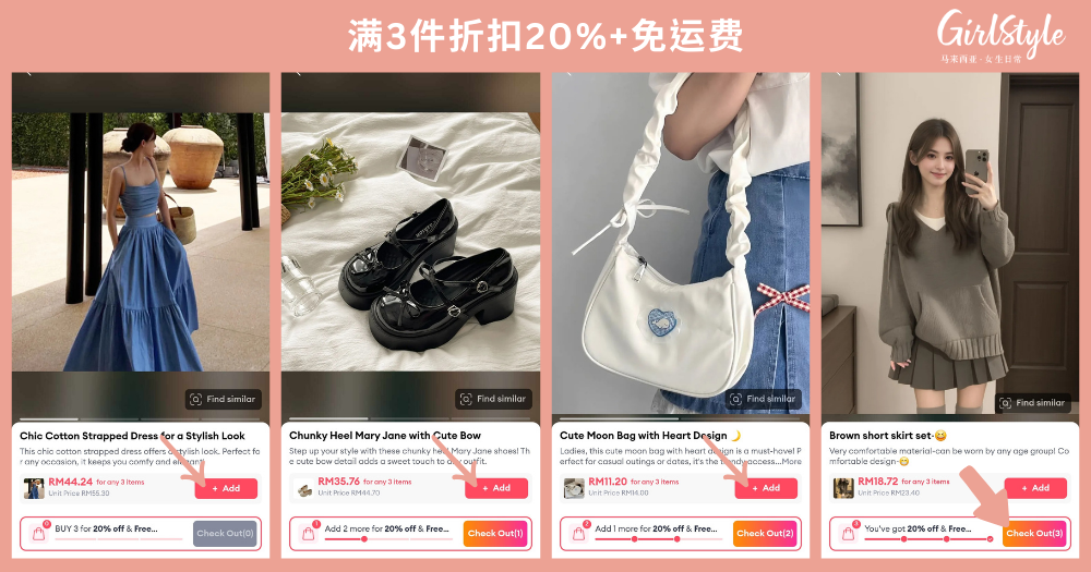 Lazada 这次不仅帮你直接连接淘宝的超多时尚好物,还推出了实打实的优惠——买满3件就能享有20%折扣!衣服、鞋子、包包、配饰等最新最潮的穿搭好物,超多样的款式和尺码选择任君挑选,买越多省越多,简直是姐妹们的一大福音~