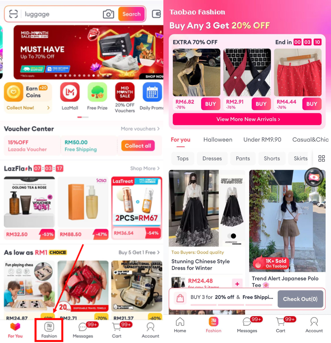 (⬆️图说:浏览Lazada App的【淘宝时尚专区】,享有满3件折扣20%以及免邮的优惠!)