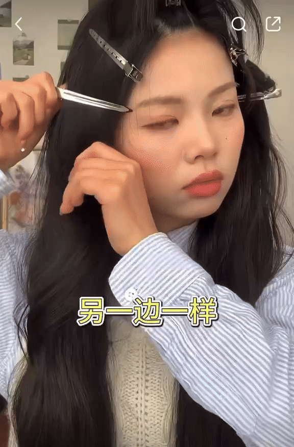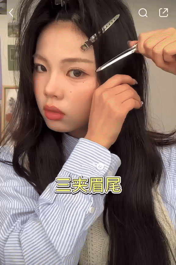 然后,将发夹夹在眉尾上方的位置。这不仅能固定头发,还能营造出一种自然的过渡效果,使整个头型更加协调。