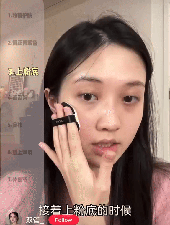 在上粉底时,应尽量避开已经遮瑕的部位。可以先在其他区域均匀涂抹粉底,最后再用粉扑上的余粉轻轻带过黑眼圈的位置。这样做可以确保整体肤色的一致性,而不会破坏之前的遮瑕效果。至于上眼皮的部分,可以暂时不处理,以免影响后续的步骤。