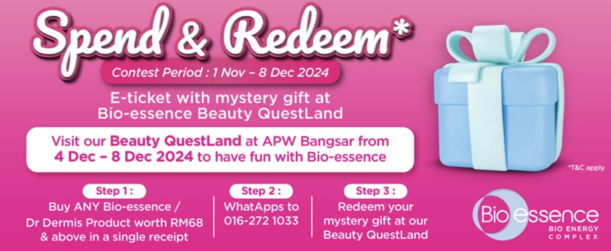 12月4日到12月8日,带上你的闺蜜姐妹到APW Bangsar一起玩转护肤任务,即可抢先体验超强保养品,还能闯关赢取好礼哦~✨而且消费满额还有神秘礼物加码,真的满满好康!😜 快点mark下日期,挑战无惧岁月的青春肌,Bio-essence 助你赢在护肤起跑线!