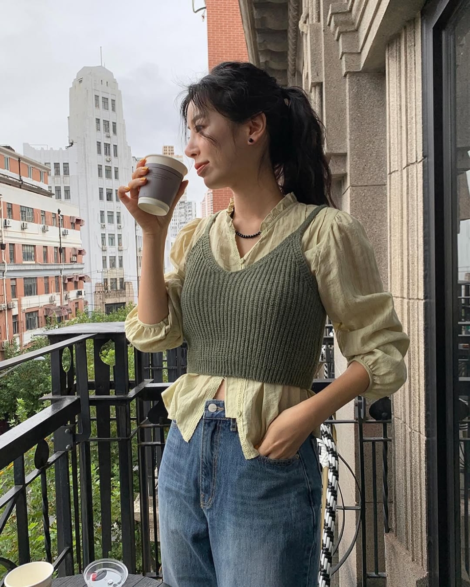 薄荷绿针织开衫配白色内搭,加上一条浅色牛仔裤,是很典型的清新挂配色。颜色柔和不腻,整体氛围特别干净,好像一杯刚泡好的花草茶,适合春夏季节出门散步、约会或看展。