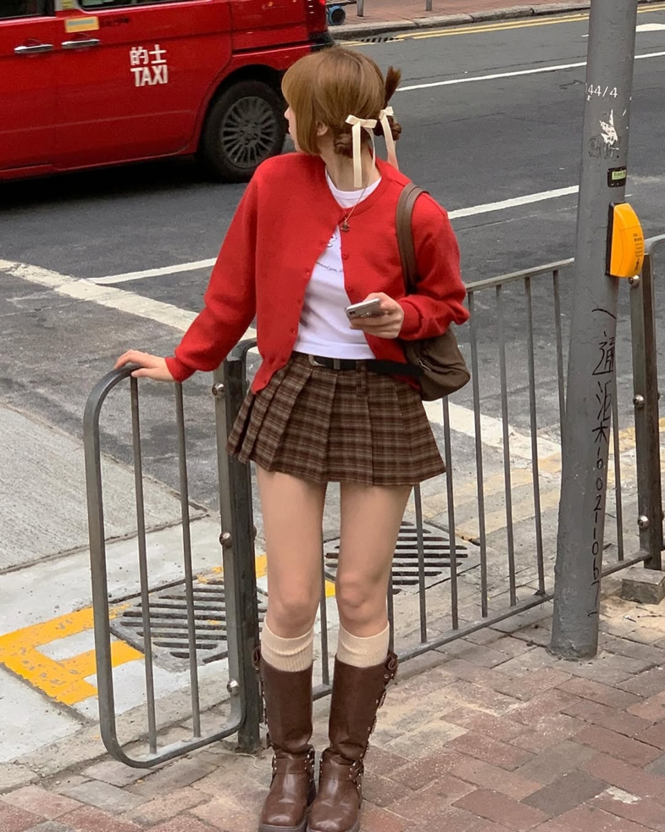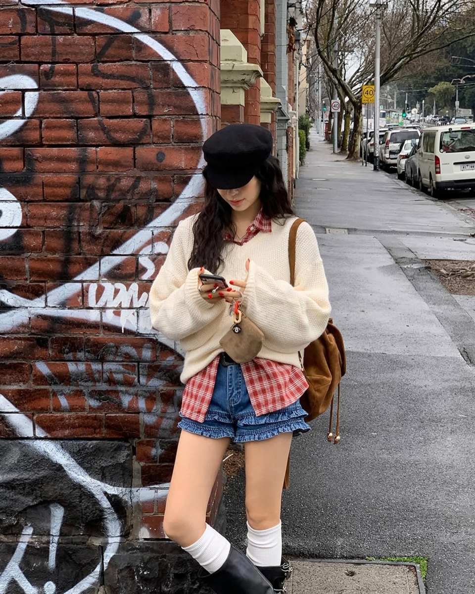 焦糖棕+蓝+白:学院感混搭穿搭Photo from IG @trendyapparel.shop