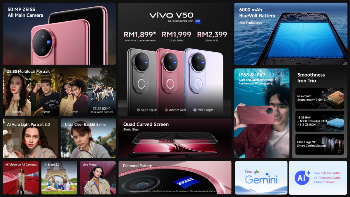 而这次活动主打的 vivo V50 达到 IP68 & IP69 级防尘防水能力,加上内置 6000mAh BlueVolt 大电池以及支持 90W 快充,耐用且持久;同时它也搭载最新的FOS15系统,提供12GB RAM + 12GB 扩展内存,操作流畅便捷。最重要的是 vivo V50 配备的 50 MP ZEISS OIS 主摄镜头,能拍出清晰细腻的大片,夜拍、特写、合影全都能轻松驾驭!