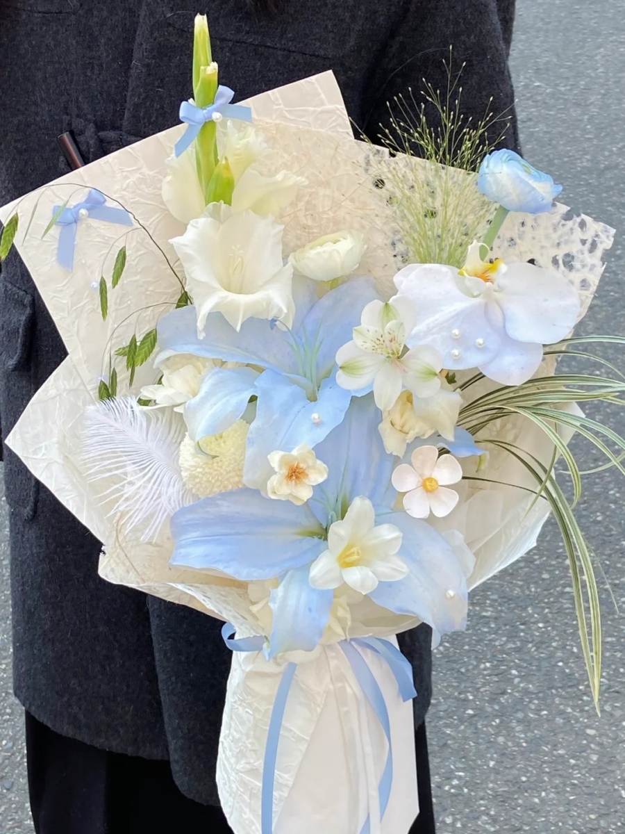 - 不确定对方喜好?选中性色系花束最安全。像白色、香槟色、淡粉、蓝紫等,既高级又不容易踩雷。