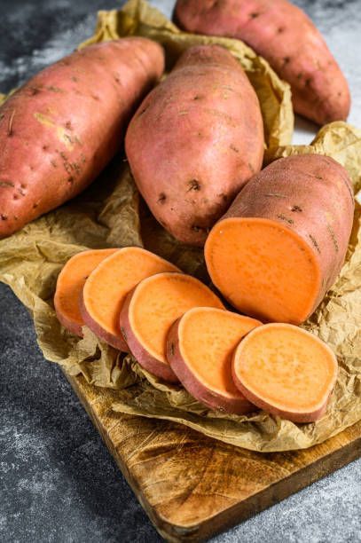 Photo from Raw sweet potatoes on a chopping Board, organic yam. Farm vegetables. Gray background.