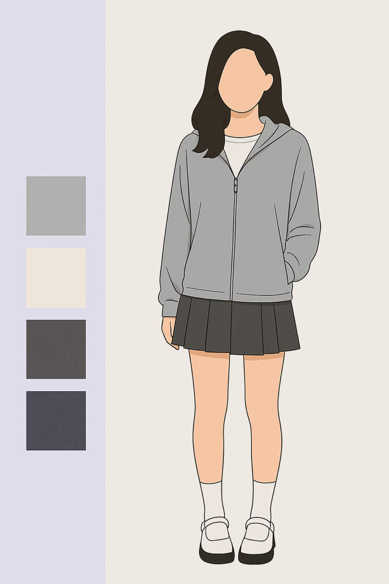 7. 浅灰色防晒衣 + 深灰色百褶裙 + 白色玛丽珍 + 白色长筒袜