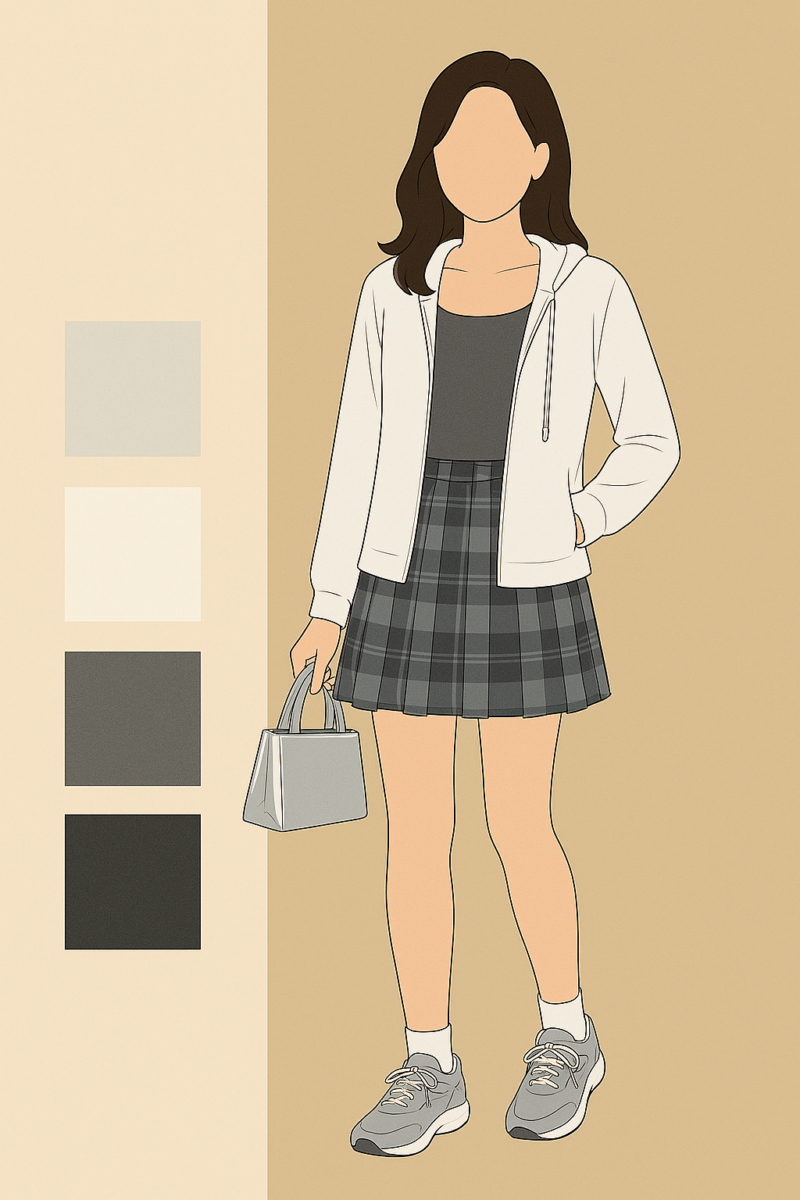 6. 白色防晒衣 + 灰色背心 + 灰色格子裙 + 手拿包 + 运动鞋