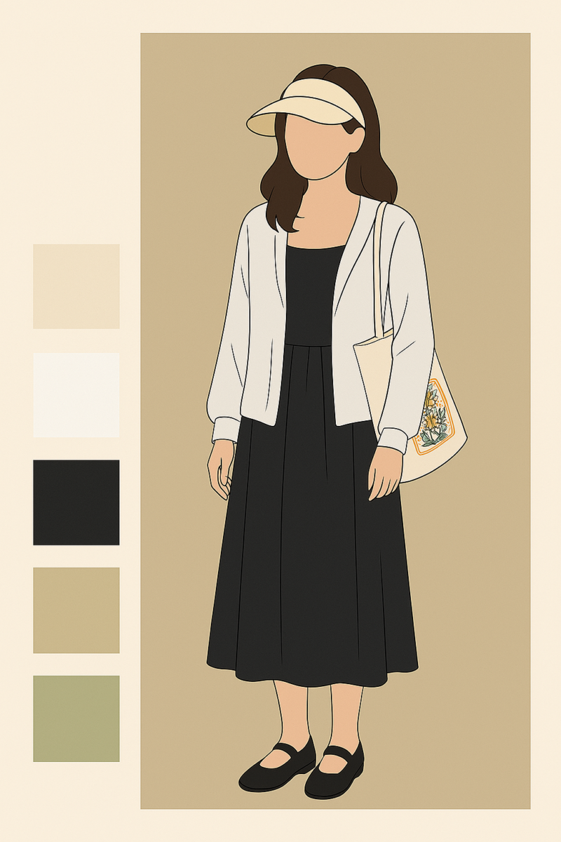 4. 白色防晒衣 + 黑色连衣裙 + 帆布包 + 小皮鞋