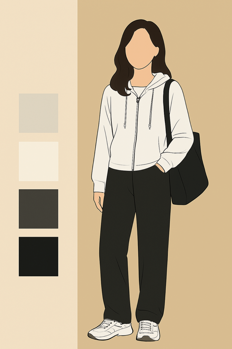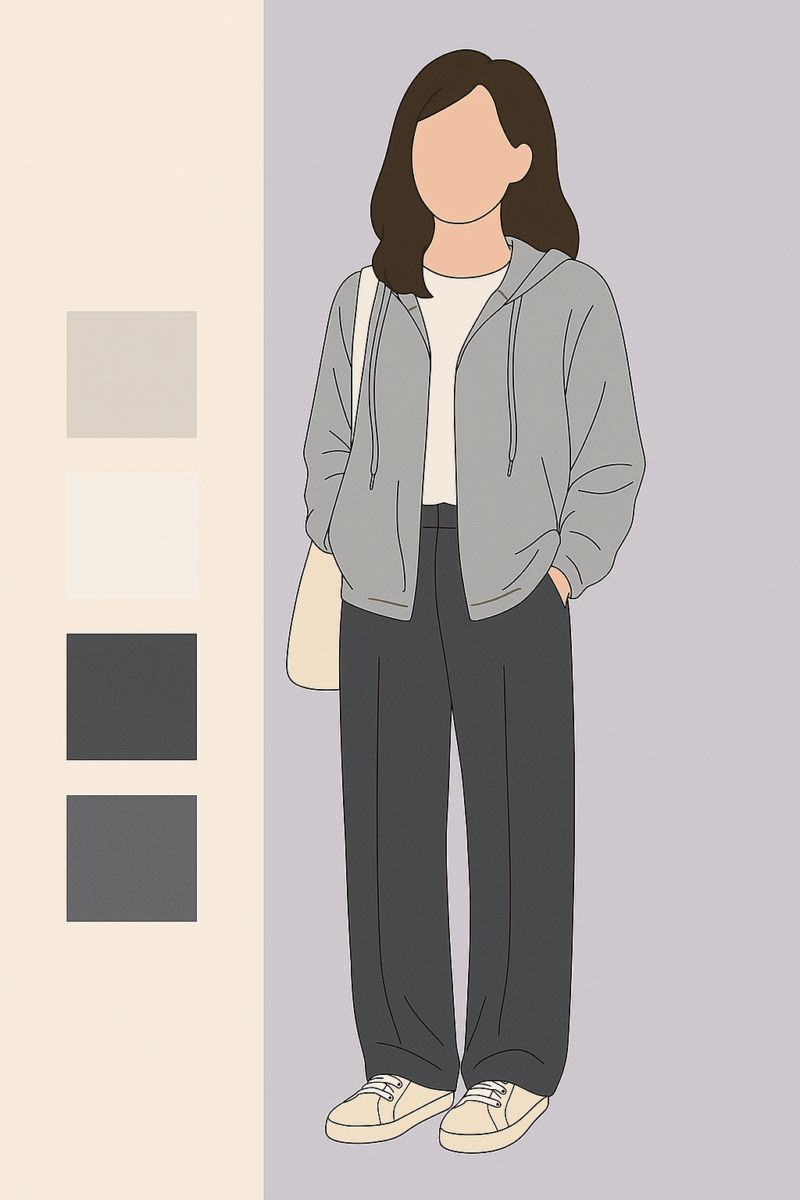 8. 浅灰色防晒衣 + 白色内搭 + 深灰色西装裤 + 帆布包 + 板鞋