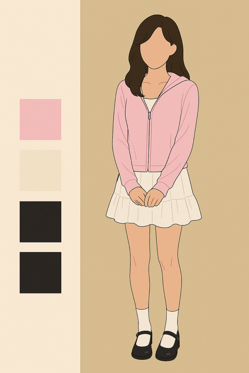 2. 粉色防晒衣 + 白色蛋糕裙 + 黑色玛丽珍 + 白色袜子