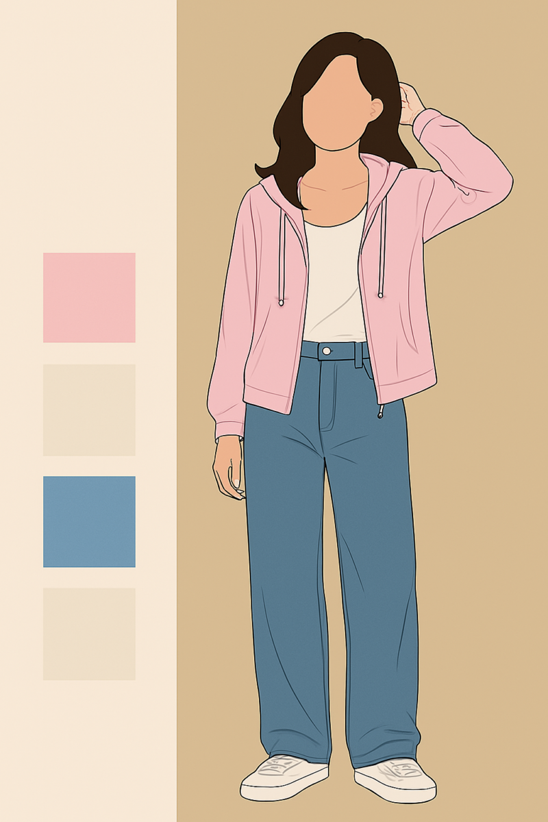 这套真的是“校园初恋感”拉满!白+粉的配色干净又温柔,搭配阔腿牛仔裤和小白鞋,清新又减龄,走在街上都觉得自己在拍偶像剧。