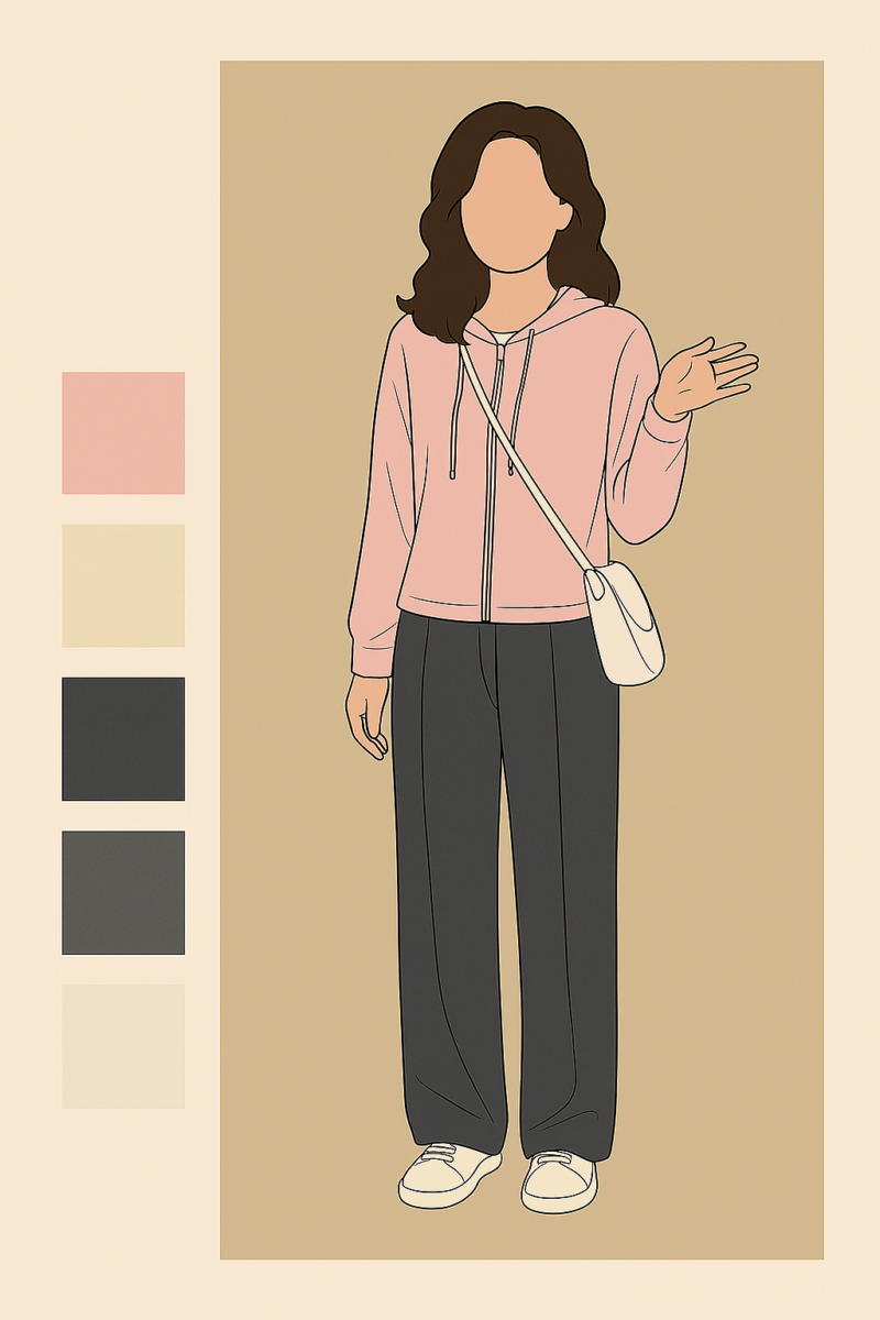 甜美也可以很有气场!粉+灰的配色低调又有层次感,通勤或日常都很适合,配个斜挎包增加亮点又增添实用性~