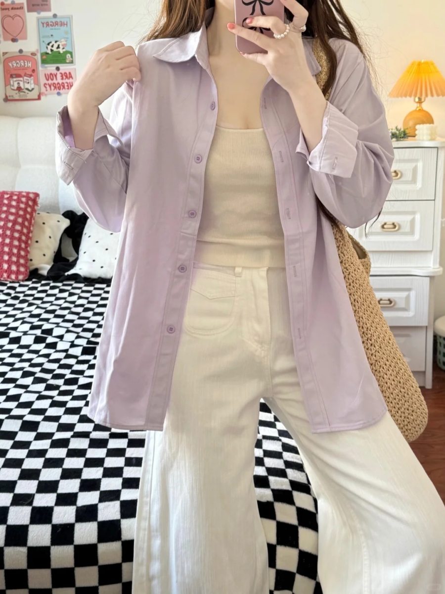 雾霾薰衣草是在淡紫色中加入了灰蓝调,减少了甜腻感,更显质感和知性。这种颜色对黄黑皮非常友好,不仅不挑肤色,还能营造出一种朦胧梦幻的氛围感,是冷感穿搭中不可忽视的显白法宝。尤其适合用在上装、衬衫、针织单品中,穿上去就是“温柔显白本人”。