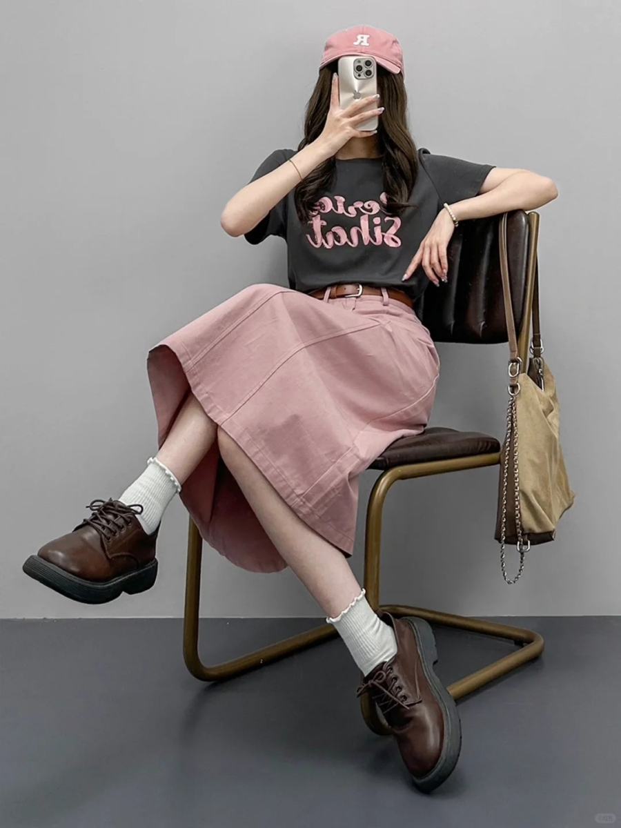 - 蓝色衬衫 + 焦糖色半裙:复古撞色感满分
