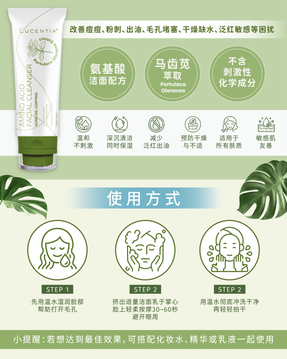Lucentia 氨基酸洁面乳正是符合这些条件的温和洁面选择。主打温和不刺激、深层清洁、维持水分平衡、控油却不紧绷,适合所有肤质,就连敏感肌宝宝也能安心天天使用。