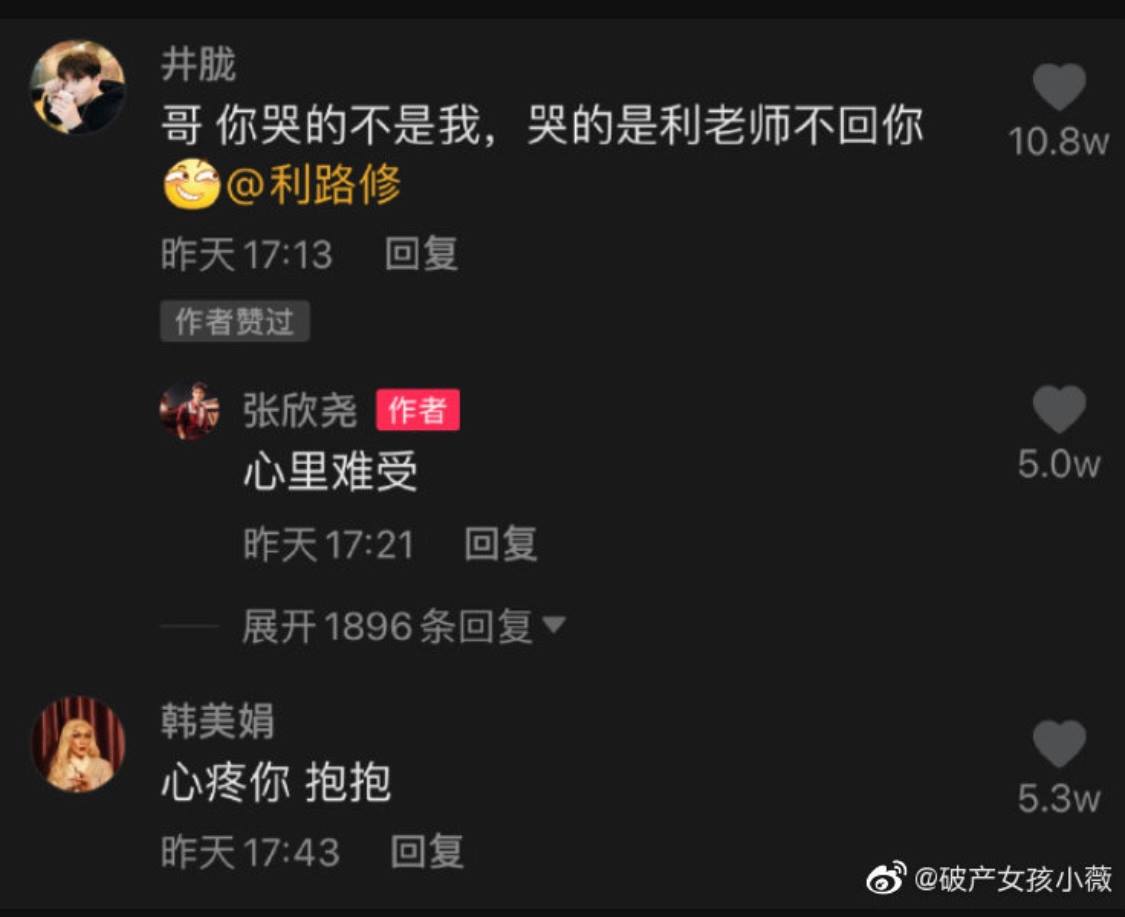 连井胧和韩美娟都冒泡安慰张欣尧:「(井胧)哥你哭的不是我,哭的是利老师不回你」、「(韩美娟)心疼你 抱抱你」。