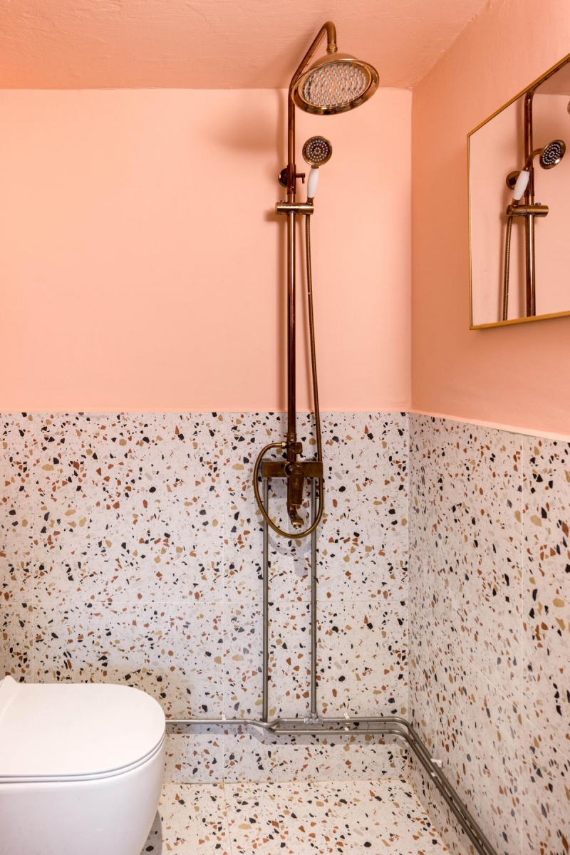 The pink theme continues in the bathroom, but with a warmer coral tone. Paired with terrazzo tiles, this design treatment gives the bathroom a slightly more playful vibe. We’re definitely saving this to our Pinterest board!