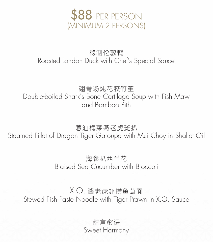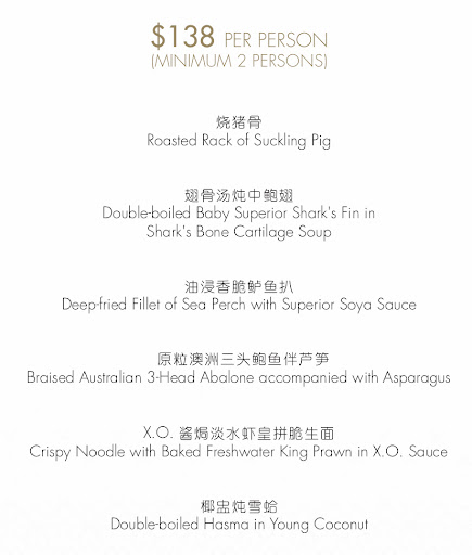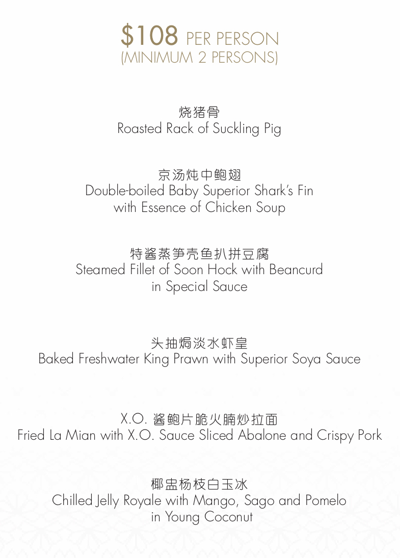 The most premium set menu option comes with heavy-hitters such as Roasted Rack of Suckling Pig, Double-boiled Baby Superior Shark’s Fin in Shark’s Bone Cartilage Soup, and Crispy Noodle with Baked Freshwater King Prawn in X.O. Sauce.