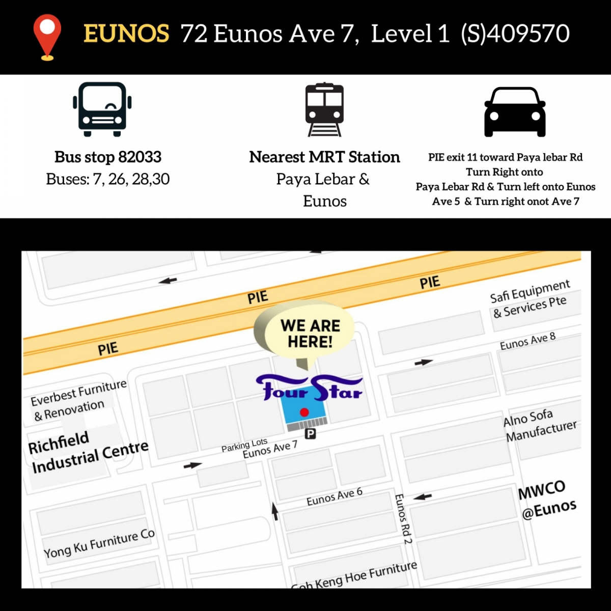 Visit Four Star’s showroom at Singapore Handicrafts Building L1, 72 Eunos Avenue 7, S409570.
