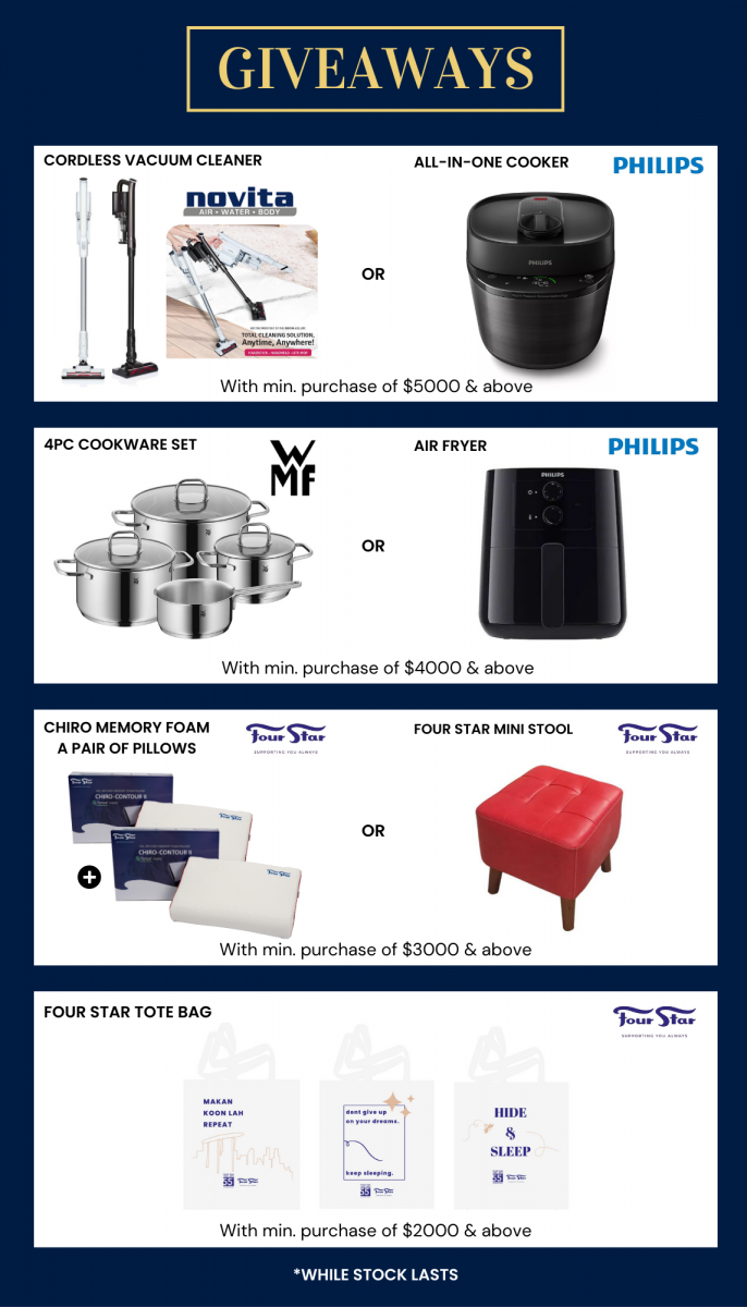 - A free pair of Four Star memory foam pillows or a free mini stool with a minimum purchase of $3,000 and above
