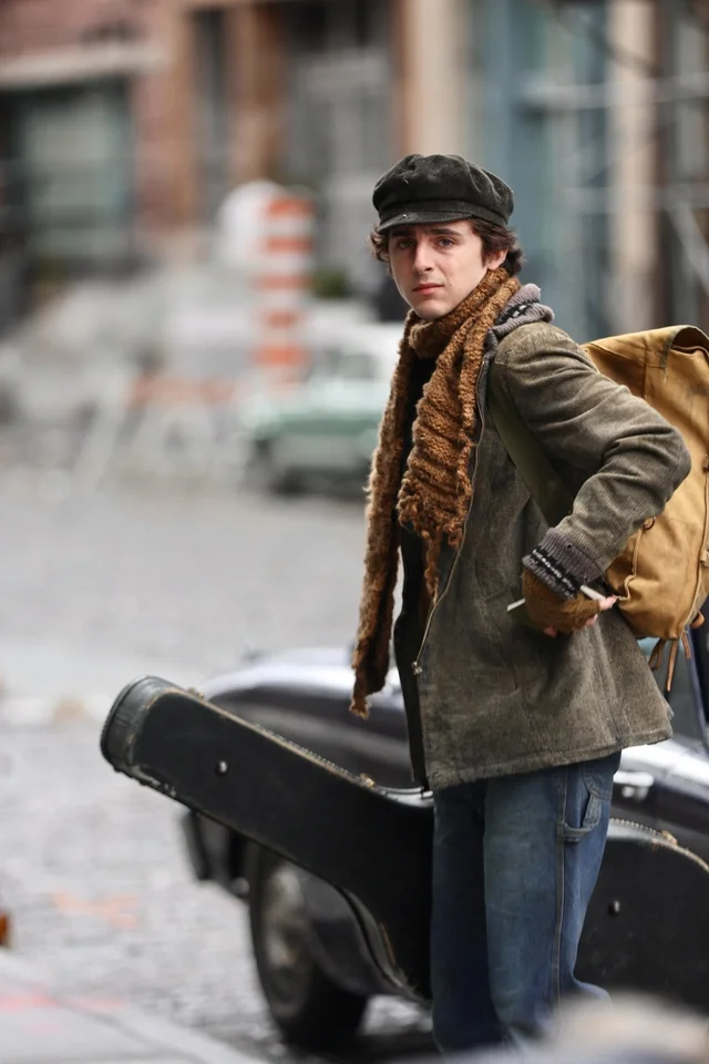 In the first peek from the set, Timothée is spotted wearing an orange scarf and a paperboy hat, carrying a mustard yellow backpack, all wrapped up with gloves and a thick green jacket. It looks like a snowy day in New York for the young Bob Dylan. And, as expected, he's carrying his guitar too.