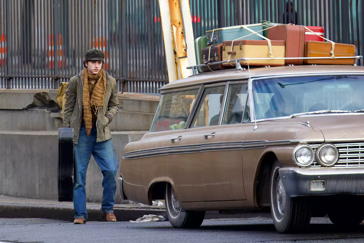 A vintage-looking car drove past him, adding to the scene for the biopic. It's said to be about Dylan's move to electric guitar in the '60s and his rise to folk music fame.