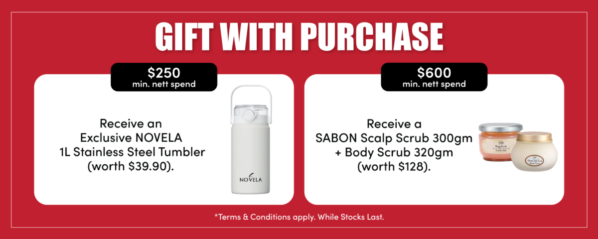 - Spend $600: Get a $25 voucher + the tumbler + Sabon scalp and body scrubs (worth $128)