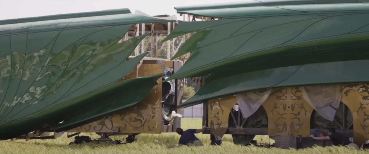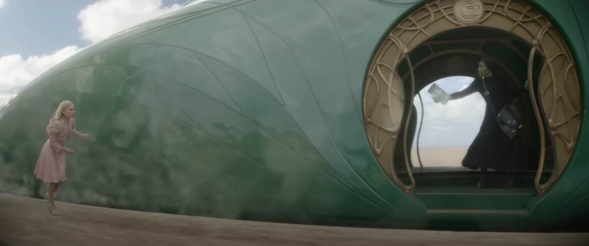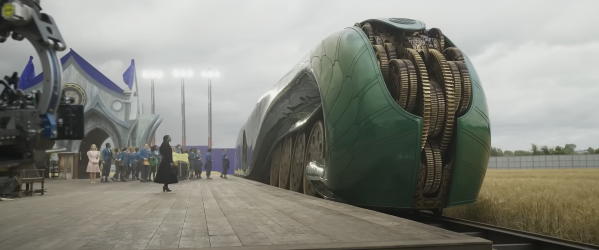 Photo from Universal PicturesThe 16-ton green train that carries Elphaba and Glinda to the Emerald City is 100% real. Moving it to the set took two full days of work.