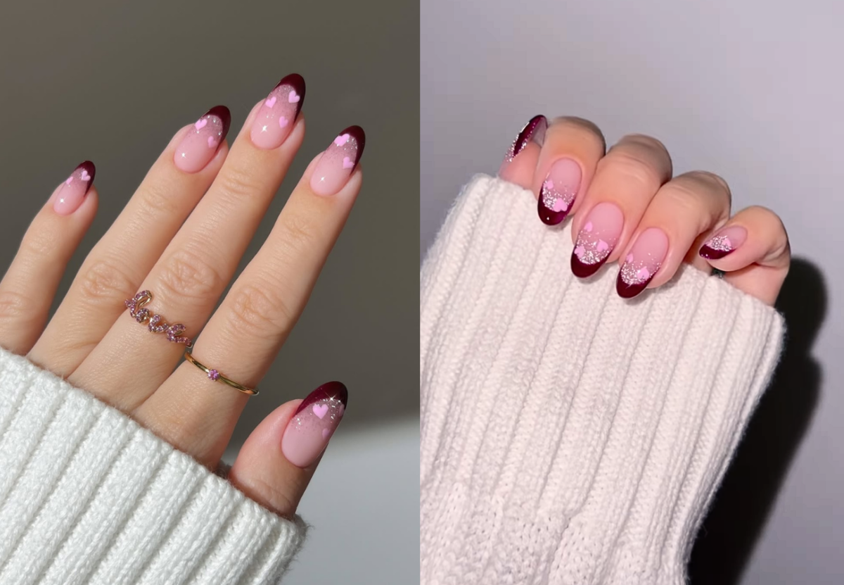 Photo from @heygreatnails via IGA mix of classy and cute! Burgundy French tips add a bold touch, while the pinkish-nude base keeps it soft and feminine. Under the tips, a layer of glitter adds sparkle, and tiny pink hearts complete the dreamy design.