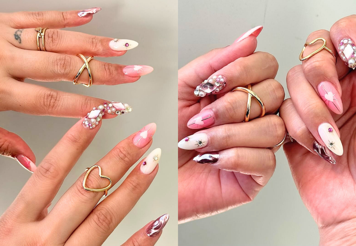 Photo from @nailzzbysteph via IGWant to make a statement? This is the design to try! Each nail features a different look—pearls and pink gems, metallic pink 3D waves, a white base with pink and diamond embellishments, and a pink heart accent nail. It screams extra and glam!