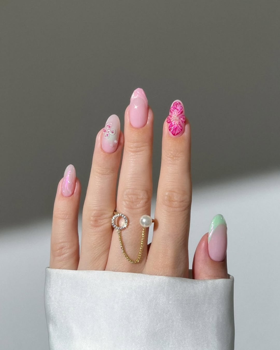 Photo from @heygreatnails via IGFloral nails will never go out of style! If pink isn't your thing, add a touch of green to balance the sweetness. Tiny pearls and a bit of glitter complete the look, making it flirty and oh-so-pretty!