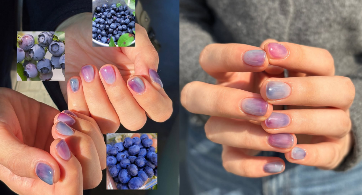These blueberry nails look like fresh berries just rinsed in water! The colours shift between deep purple and soft blue, with a smooth, glassy topcoat that makes them look so plump and juicy.