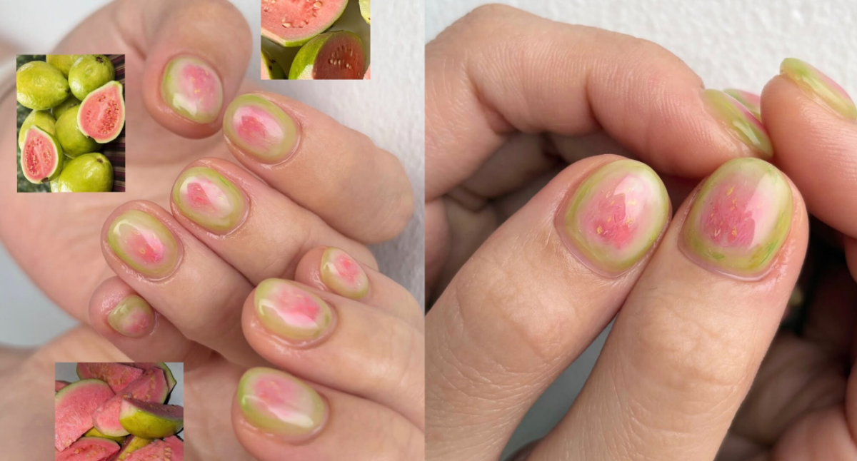 This one takes fruit-inspired manicures to a whole new level. The design starts with a green outer layer, a pink centre, and a creamy ring just like a real pink guava. Some even add tiny seed details to make it even more realistic. It’s fun, fruity, and stands out in the best way.