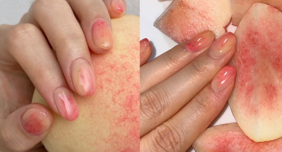 There’s something so soft and satisfying about the colour of a ripe peach. This manicure gets it right, with a gradient of warm yellow melting into blushed pink. Even the tiny specks scattered across each nail mimic the fuzzy skin of the fruit, making it look even more realistic.