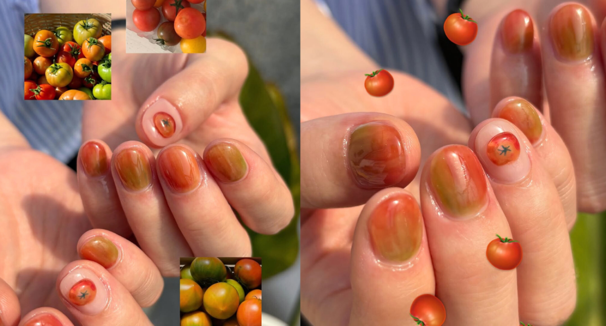 This one captures the ripeness of real tomatoes with shades that blend from deep red to orangey red, and even a hint of green. The gradient is beautifully done and gives each nail that sun-ripened glow. You can also try a full tomato fruit design on one or two fingers if you're feeling playful!