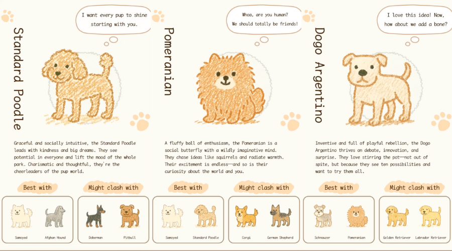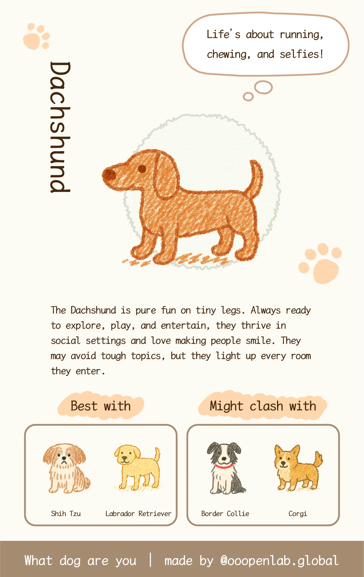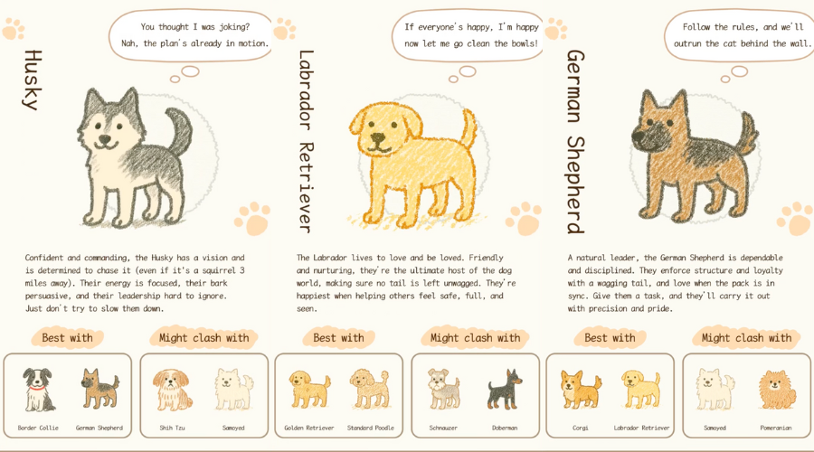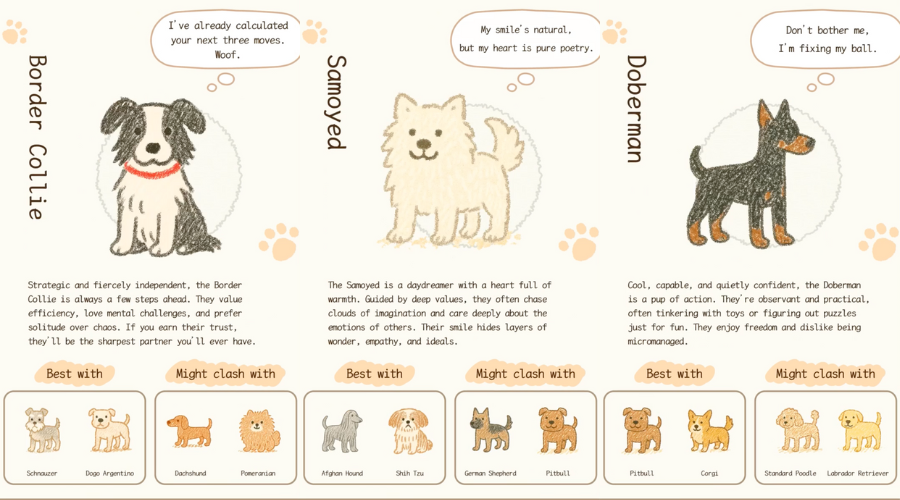 You might be a loyal Corgi, a dreamy Samoyed, a smart and independent Border Collie, or a bold Husky with a plan. Each result comes with a cute thought bubble that says what your inner pup might be thinking.