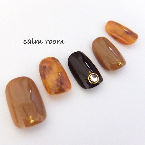 在秋冬之際,琥珀指彩是最合時宜的款式,除了經典不退流行外,搭配其他元素更能讓指甲變得超有質感。有個性的女孩可以用跳色的方式加入黑色,並且用卯釘、水鑽等小物件裝點指尖。再戴上戒指之後,最時尚的那個非你莫屬。