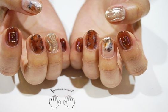 不喜歡指彩顏色這麼重的人,就可以請美甲師以黃色、橘色、淺咖啡色打造適合你的風格。水鑽、金屬及淺色系做裝飾,這款最適合喜歡每隻指甲都做不一樣款式的你。