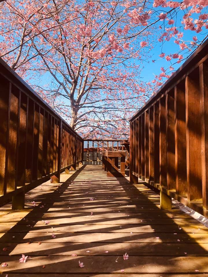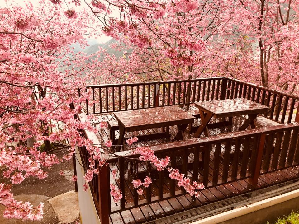 同樣在新竹縣尖石鄉,「財伯觀光果園」美到小編不得不注意它!一個木棧板日式小憩庭,兩側諾大的櫻花樹滿開,枝葉交錯於藍天,隨便拍都像一幅畫一般~就像沐浴在櫻花海裡,超級浪漫!