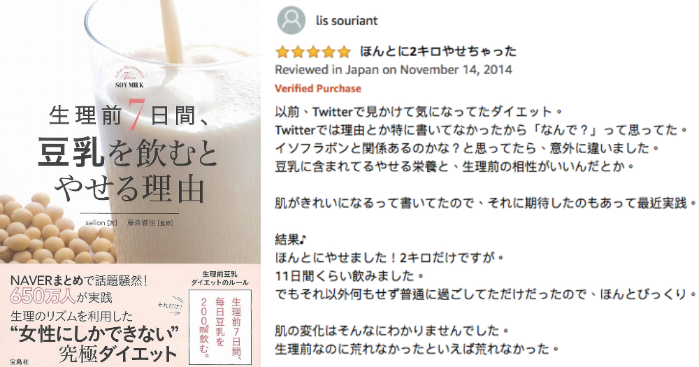 當月經結束後體內雌激素增加,新陳代謝速率提高就能有效減脂,讓減肥效果大加分!除了作者本人靠著喝豆漿瘦身成功之外,許多跟著喝的讀者也紛紛表示:「真的會瘦!我喝了約11天,雖然只有2公斤還是很感動。」、「好驚訝在經痛方面改善了!從現在開始要天天喝♪」、「女人的身體真的很有趣!月經來臨前的不尋常食慾期似乎已經消退了」、「我會開始期待月經來臨!真的可以減肥」。