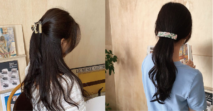 抓夾在好些年前也流行過,但韓系流行的抓夾配色多以乾淨、舒服的琥珀色、淺色系為主,較小的抓夾適合做公主頭的造型,而長條的抓夾用來做馬尾造型,一夾上去馬上氣質感爆增!