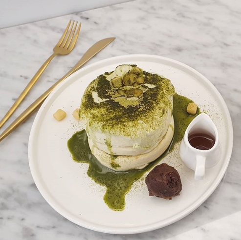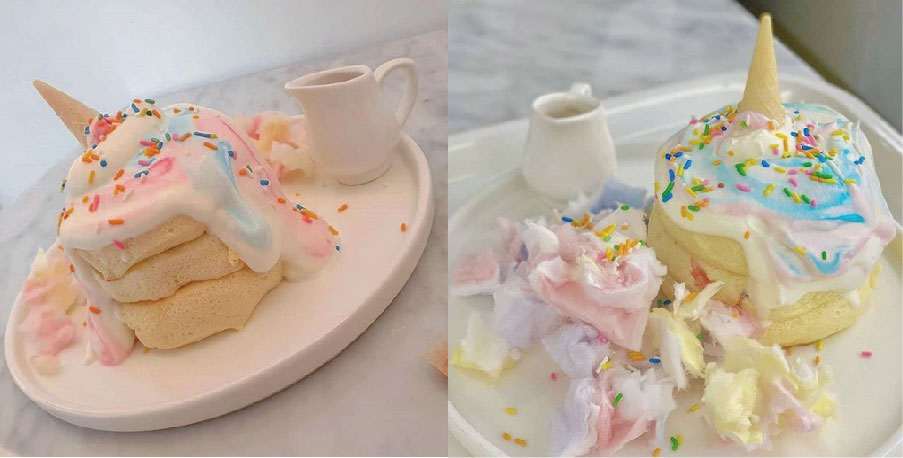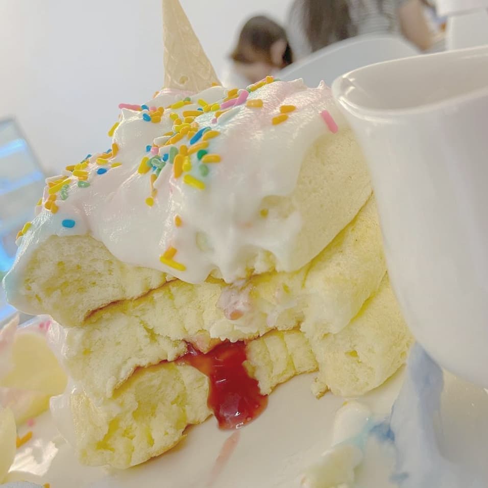 打開店家的Instagram,可以看到不少彩虹獨角獸舒芙蕾的身影!最近許多韓妞就是衝著這道餐點來的啊!綿密的彩虹鮮奶油,灑上巧克力米,旁邊再加上彩色棉花糖,沒有女生看了不會心動的吧!舒芙蕾鬆餅也是很不客氣的用了三層,超厚超滿足,和姊妹共吃一份剛剛好!
