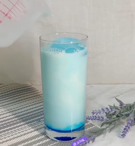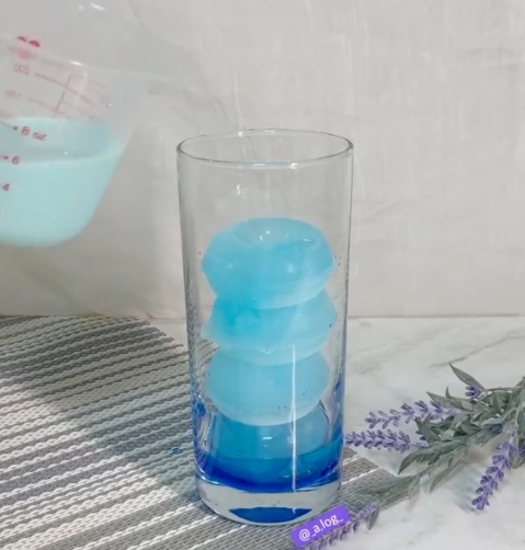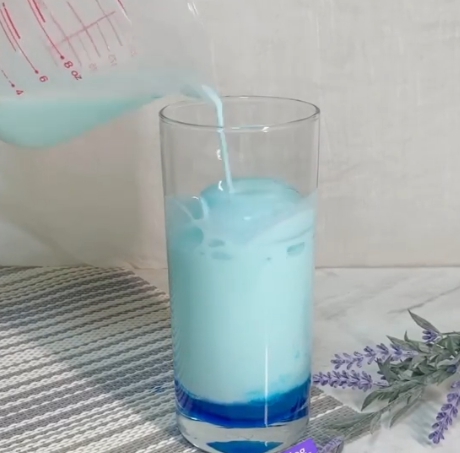 步驟3:加入藍柑橘醬混和的牛奶,加至7分滿,製作第一層漸層。