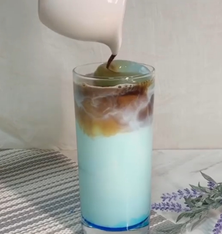 步驟5:再倒入步驟3使用過的藍柑橘醬牛奶,將漸層做最後的收尾,這裡不用倒太滿,大約9分滿即可。
