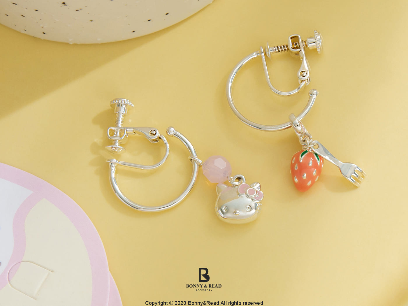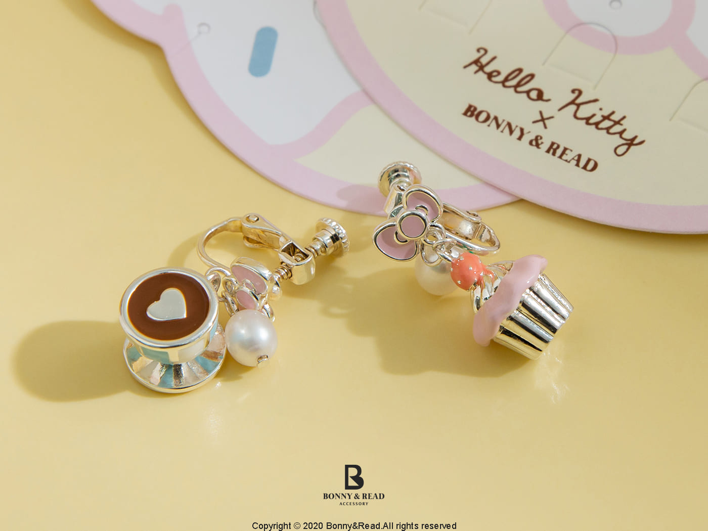 BONNY & READ x HELLO KITTY 午茶派對系列推出六組針夾兩式耳環,善變的女孩可以選擇「知心午茶耳環組」和「甜蜜午茶耳環組」,一組共有六款造型圖案任你排列組合,除了KITTY之外還有她的超萌好友泰迪現身,以凸面金屬或線條滴油填色來表現,低彩度的貼耳款設計更能展現你的活潑俏麗,也不用怕被口罩掛繩勾到啦~ 想要與眾不同的女孩可以選擇「甜蜜野餐耳環」、「甜心可可午茶耳環」和「草莓午茶耳環」,不對稱的垂墜設計配上珍珠、碎鑽點綴,可愛又不會太幼稚,而且一次購買這三款還能互相搭配喔~ 走優雅氣質路線的女孩可以選擇「草莓甜心耳環」粉色施華洛世奇水晶配上鮮紅草莓和KITTY金屬頭像,在陽光下會Bling Bling閃耀,讓你仙氣大增!