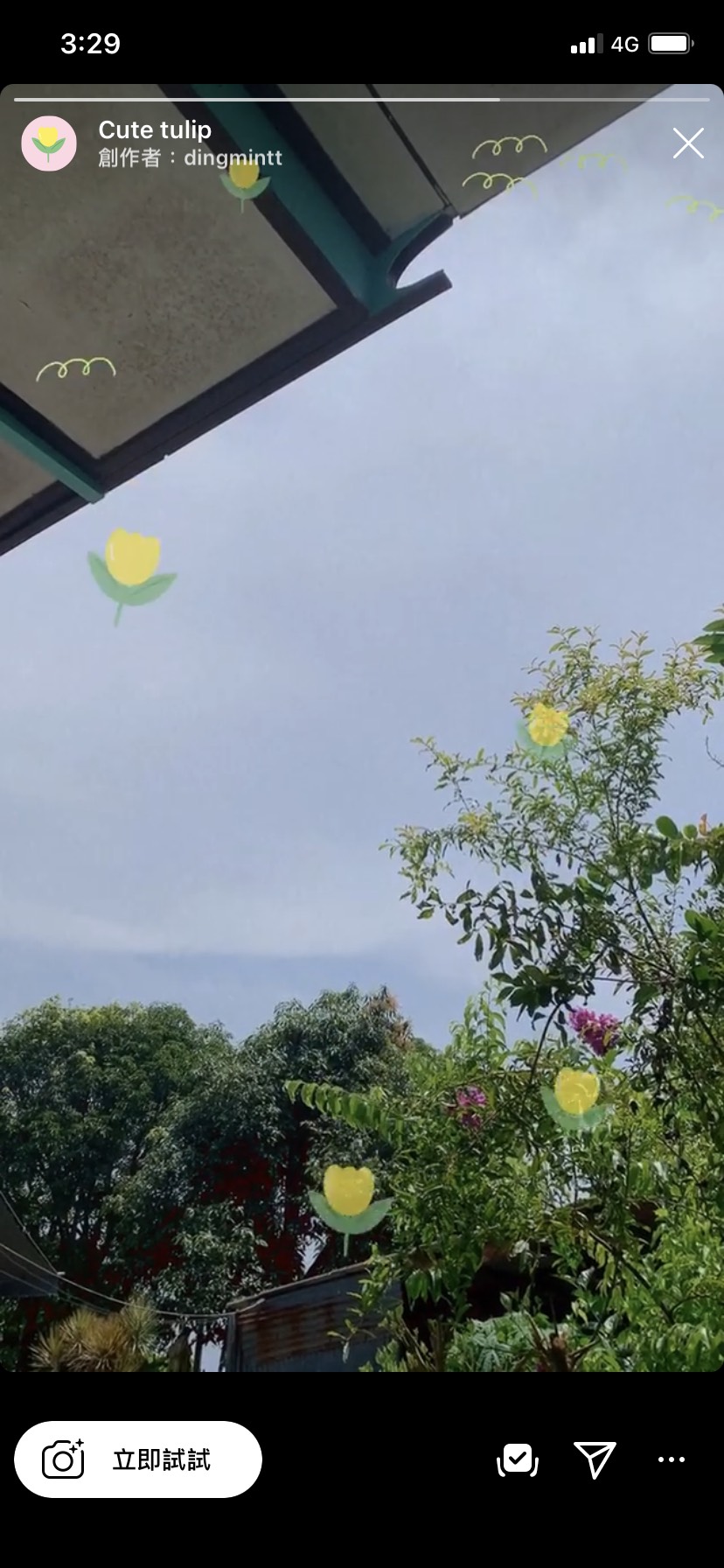 說到復古的代表花種,除了玫瑰花之外,應該可以說是鬱金香了吧!這款特效在使用時畫面會飛出許多鬱金香,濾鏡色調也帶有些灰感,拍攝風景起來別有一番風情,小編首推!