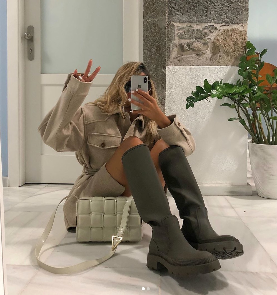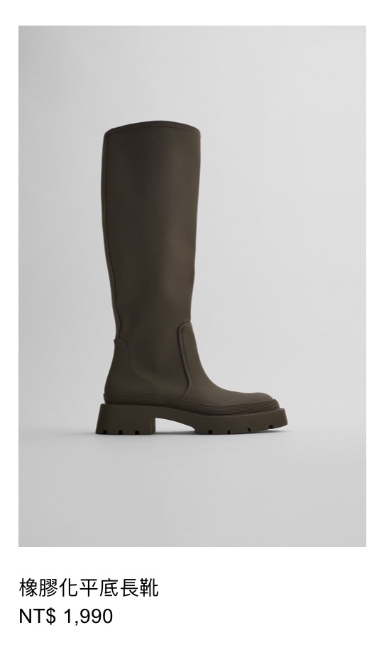 除了皮革款,另一款橡膠化的平底長靴也是也值得入手的選項,比起一般的黑,竟是超氣質的卡其綠!這款ZARA棕綠色橡膠化平底靴搭配了長靴筒及溝紋鞋底,個性十足又不容易跟路人撞款,強烈推薦給穿搭高手們~