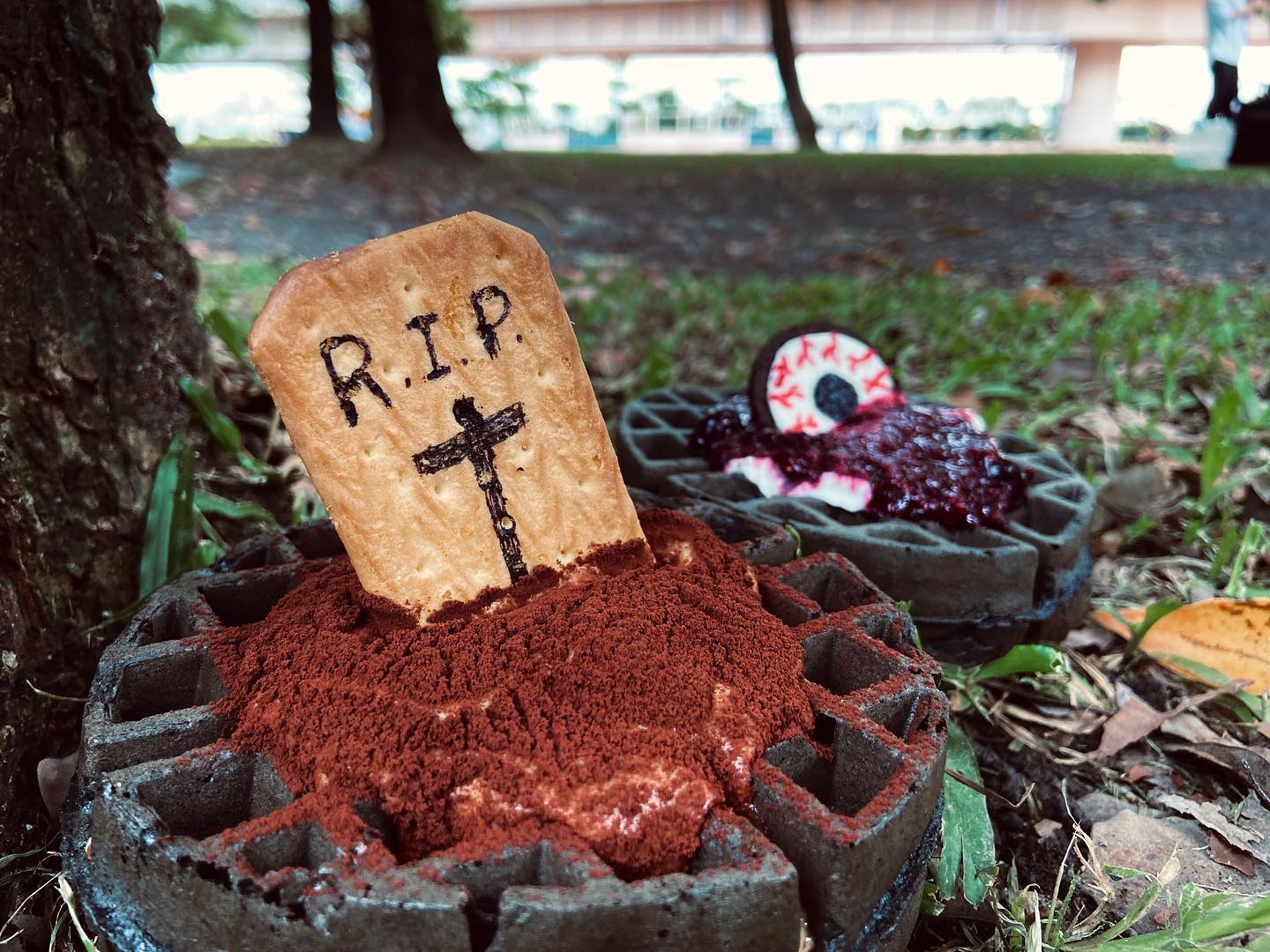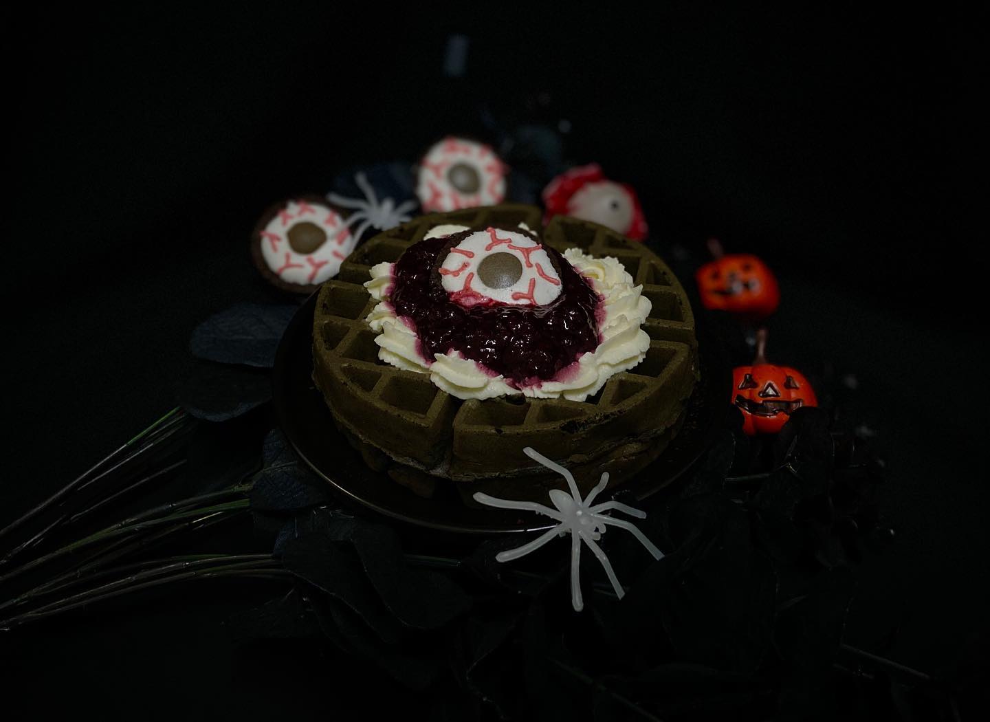 超可愛的迷你掌上鬆餅也跟上萬聖節潮流啦!「毛利鬆餅」是高雄人氣超高的三輪餐車美食,平常不定期出現在市集或包車活動中,但為了萬聖節,老闆特別研發出特製限定的泥炭鬆餅,搭配上超逼真的紅眼珠烤糖霜餅乾,造型驚人卻又意外討喜,尺寸精巧就跟手掌一樣大,就算一個人想吃鬆餅也完全沒負擔~